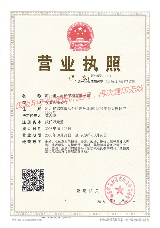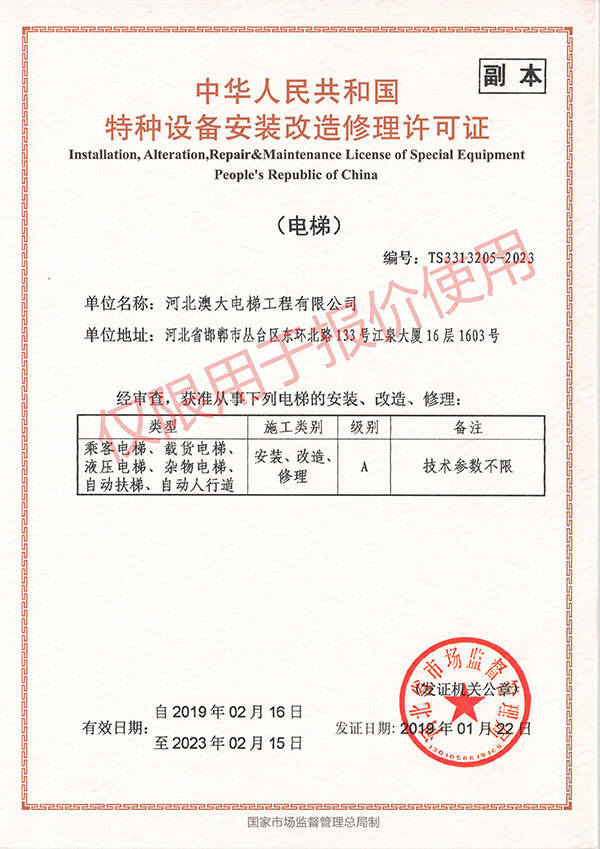 河北澳大電梯工程有限公司是集電梯銷售、安裝、維護保養(yǎng)為一體的專業(yè)化電梯公司。公司具有國家質量監(jiān)督檢驗總局頒發(fā)的“電梯安裝改造維修A級”資質許可證。下設市場部、工程部、維保部、技術部、行政部及電梯配件公司。